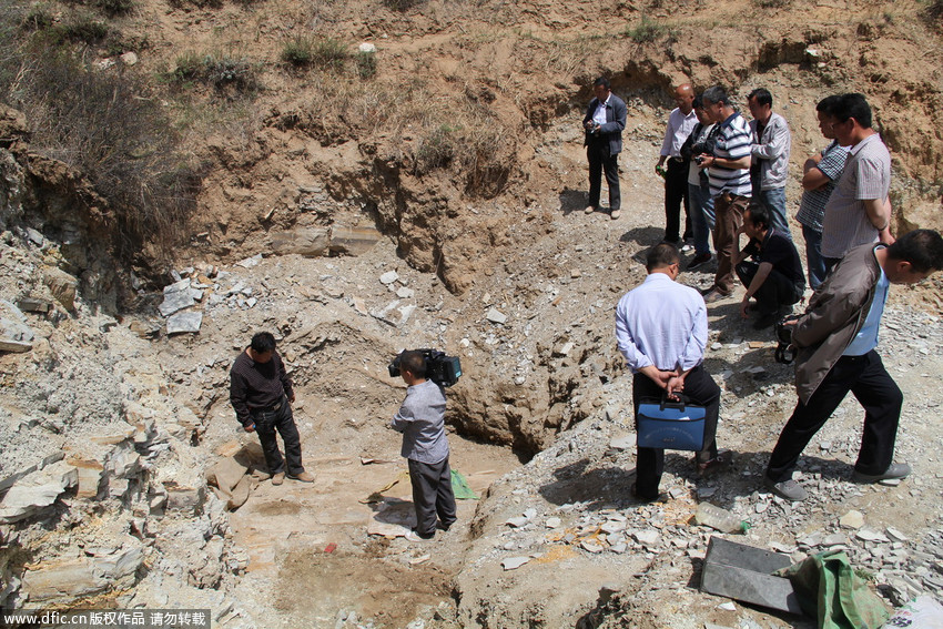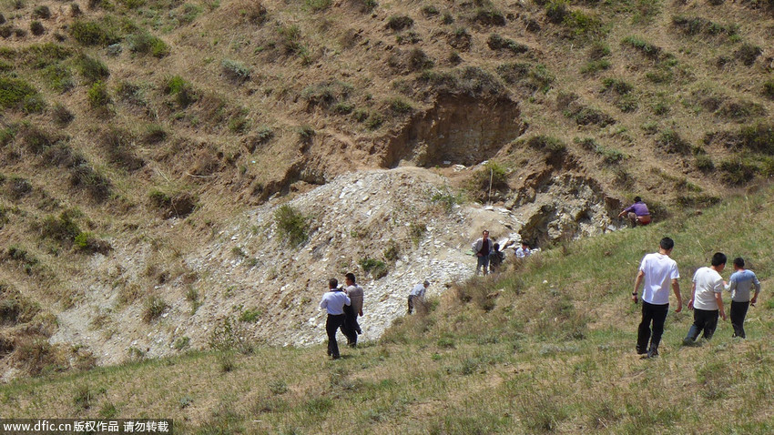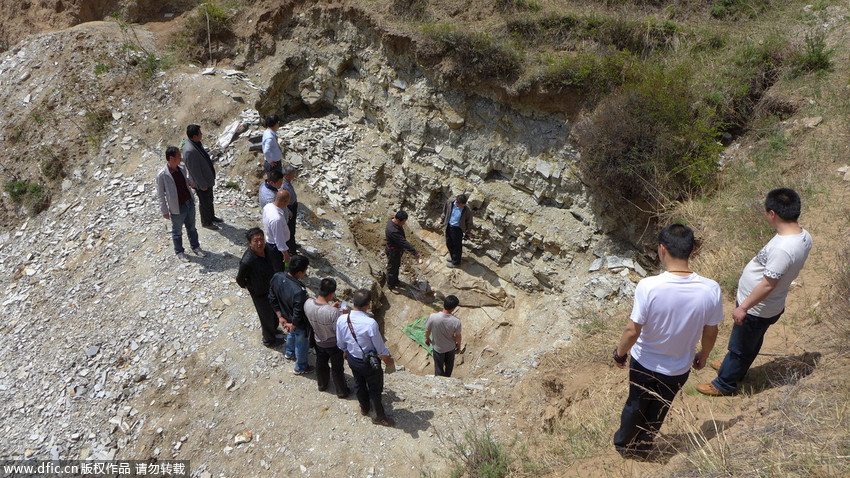 圖為“恐龍化石”發(fā)現(xiàn)現(xiàn)場。王月攝 (記者蘇克、王海琦通訊員楊柏成、王月)5月21日,豐寧滿族自治縣文物保護(hù)管理所接到消息稱:該縣四岔口鄉(xiāng)李起龍村山梁上發(fā)現(xiàn)古脊椎動物化石。