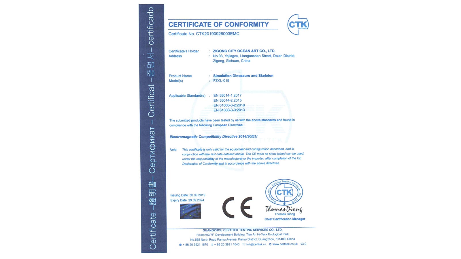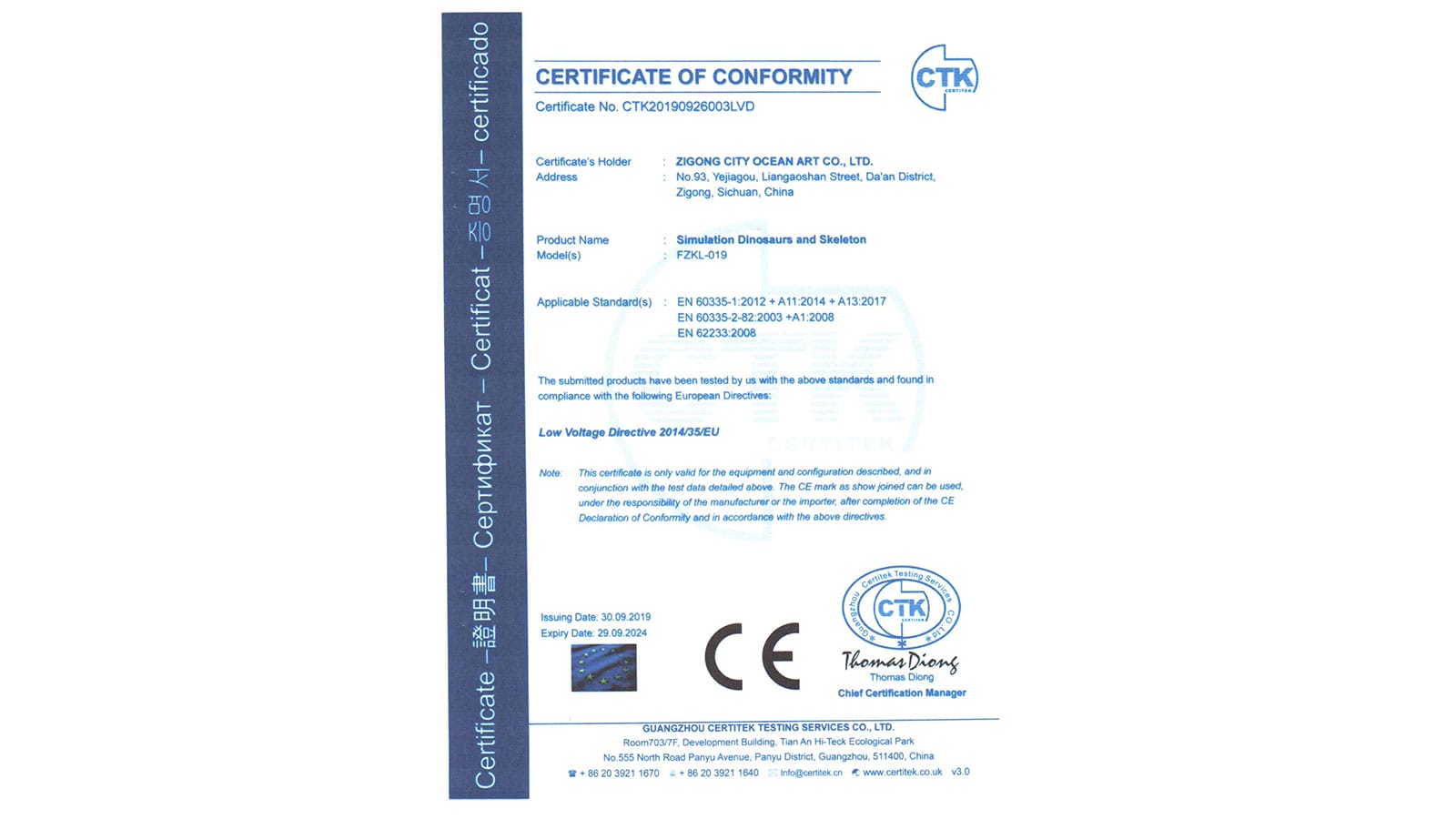 CE認(rèn)證證書(shū)(仿真恐龍)-資質(zhì)證明-專業(yè)仿真恐龍生產(chǎn)廠家-自貢市大洋藝術(shù)有限責(zé)任公司