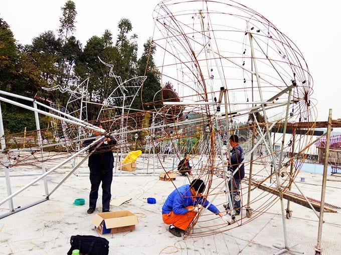 3、燈具安置: 絲架造型制作完后,由電工將燈泡、熒光燈管、霓虹管燈燈具安置在絲架造型內(nèi)部,用尼龍?jiān)鷰Ч潭ê?。有外光源的燈組則需在裱糊結(jié)束后再將霓虹管、LED等固定在燈組上面。