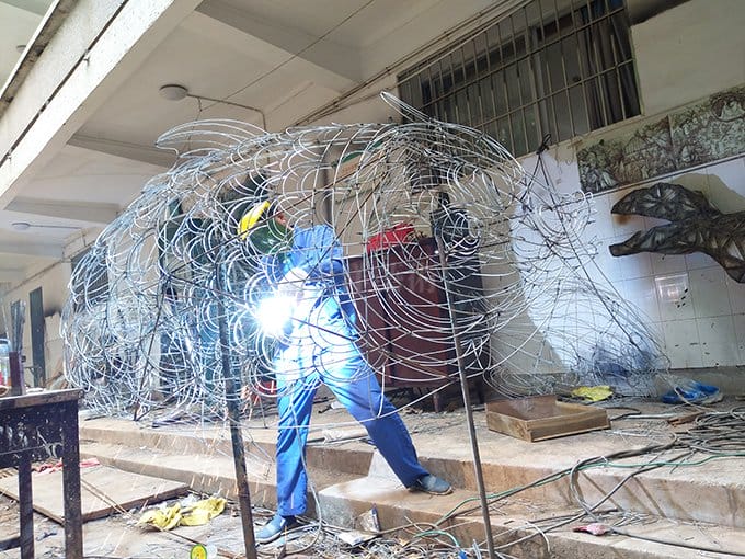 2、絲架焊接造型:鉗工通過(guò)扳、錘、剪、彎、焊等工藝,用鐵絲、元絲等彎成美工畫(huà)出來(lái)的圖形線(xiàn),再焊接、牽絲、加固、支撐等,使之變成三維的、立體的、多角度觀賞的絲架造型。