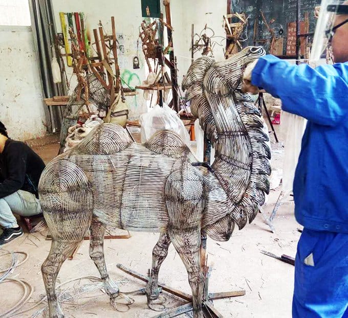 學(xué)生在焊接絲架時(shí)應(yīng)適當(dāng)概括形體,這是由鐵絲(元絲)的屬性決定的,市場上銷售的鐵絲(元絲)有一定的韌性和一定的粗度。做大型的絲架可以用元絲,中型的可以用8#、10#鐵絲,小型的則用12#、14#鐵絲。絲的屬性導(dǎo)致在制作復(fù)雜形體時(shí)有著很強(qiáng)的局限性,特別是小型的絲架,絲架越小,難度越大,細(xì)節(jié)越不好表現(xiàn)。所以需要學(xué)生靈活處理,適當(dāng)?shù)倪M(jìn)行歸納,保留大的形體,舍去小的結(jié)構(gòu)。