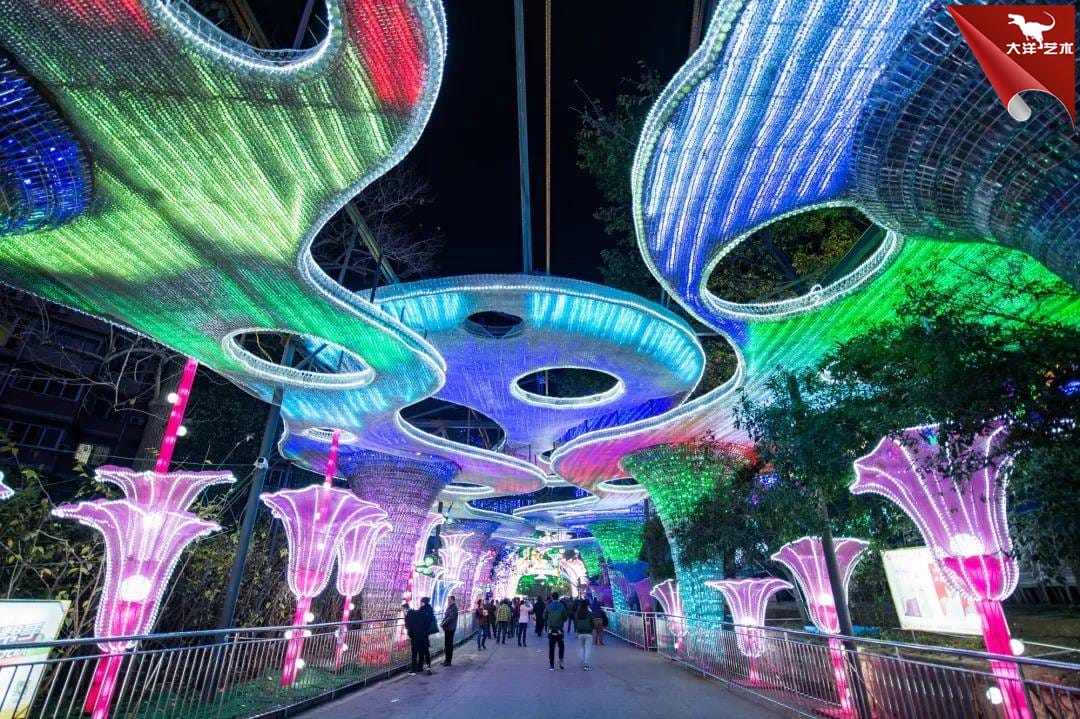 壯觀。置身其間,仿若進入璀璨晶瑩的世界。燈組長46米,距地面5米高的彩云,錯落交叉布局,覆蓋10米寬的通道。僅制作頂部