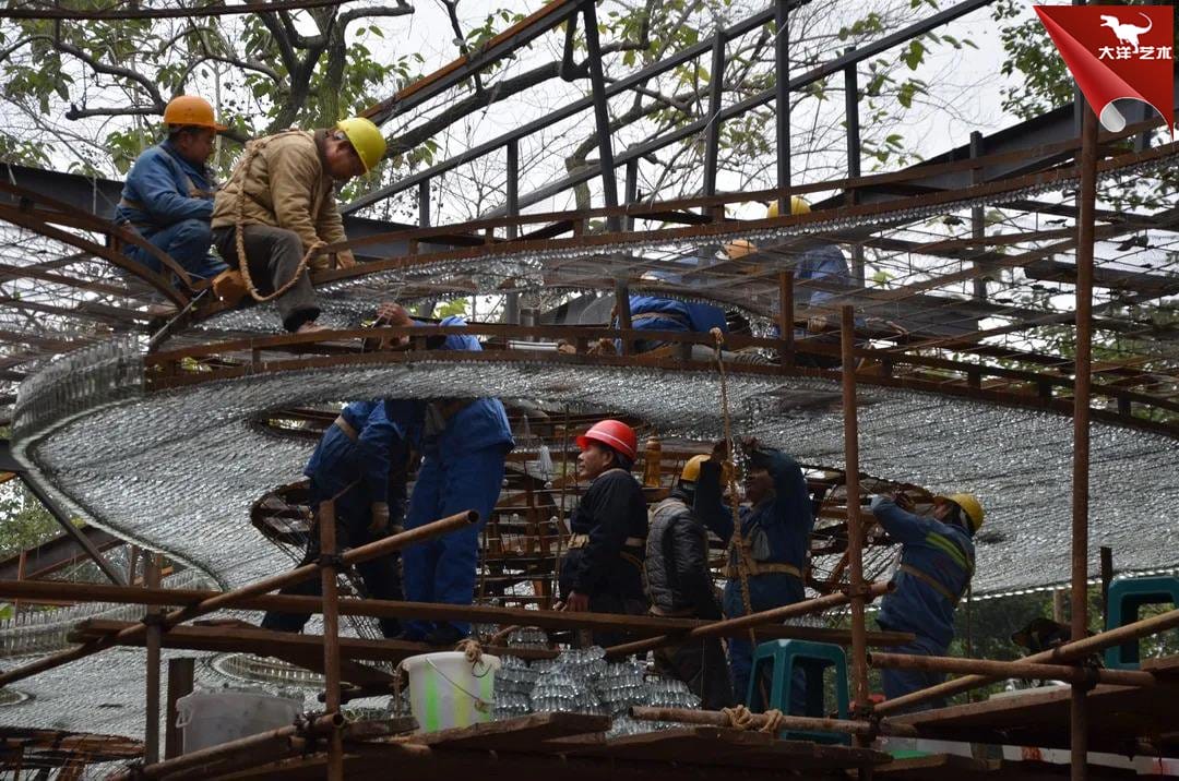 彩云的青霉素玻璃藥瓶燈就達30多萬個,灌水后達到12噸重;制作立柱的啤酒瓶達5000多個。
