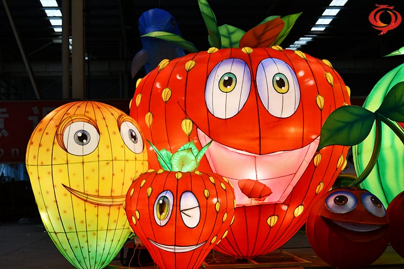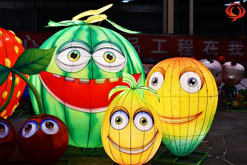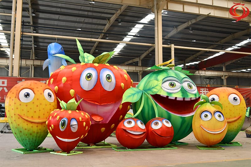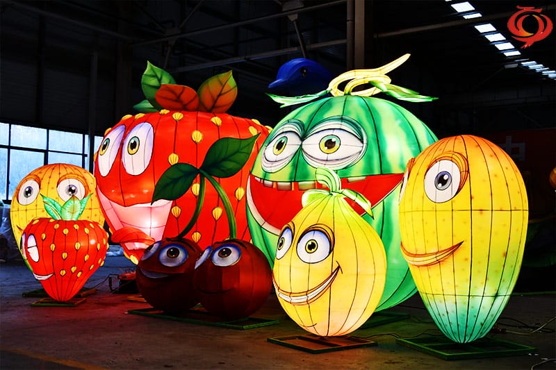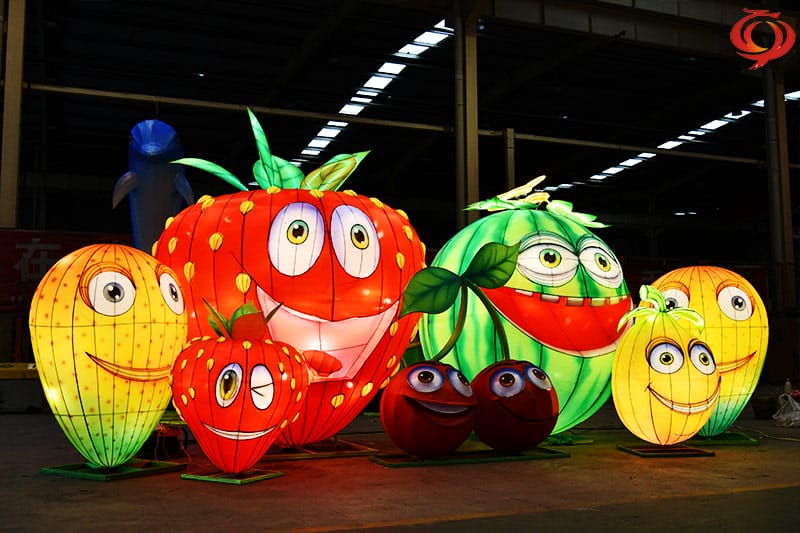 水果主題花燈,該花燈燈組主要有西瓜花燈、櫻桃花燈、芒果花燈、草莓花燈等造型,寓意著甜甜蜜蜜。