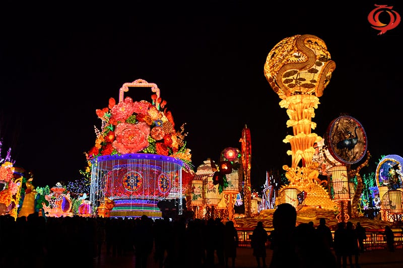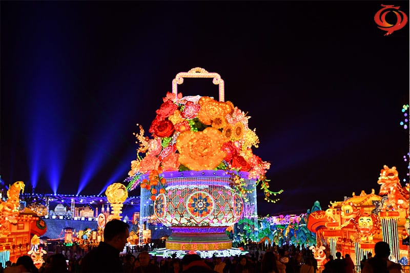燈組創(chuàng)意設(shè)計(jì)了一只巨大的花籃,美麗的玫瑰富貴吉祥的牡丹、高尚無(wú)私的菊花、幸福浪漫的郁金香盛滿花籃,彩燈制作的朵朵鮮花嬌艷開(kāi)放,迎接八方游人,送上新春的祝福、巨型花籃選用7萬(wàn)余件精美瓷器手工捆扎而成,精湛精致,巧奪天工。燈組重達(dá)56噸,藝術(shù)地傳承了自貢燈會(huì)的非遺工藝,創(chuàng)造性將傳統(tǒng)工藝瓷器和現(xiàn)代光源融合在一起體量震撼視覺(jué)沖擊力強(qiáng)成為本屆燈會(huì)瓷器燈王