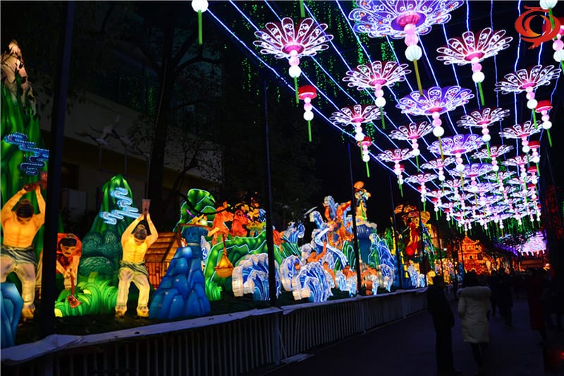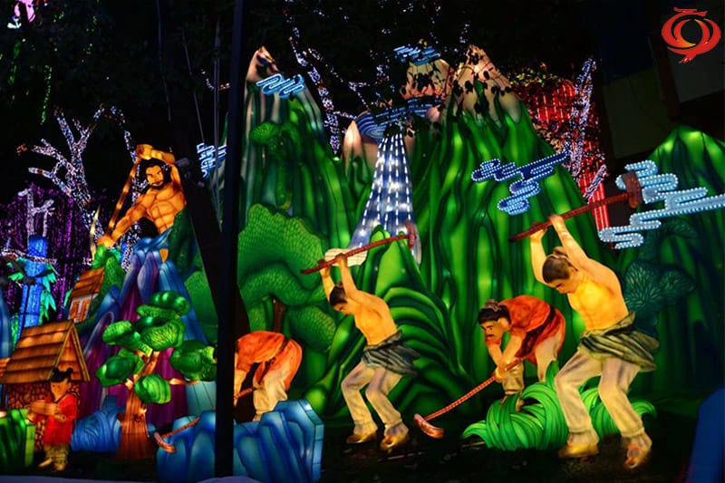 歷史典故彩燈制作案例——《大禹治水》彩燈燈組整體鋼架結(jié)構(gòu),彩燈燈組整體采用傳統(tǒng)絲扎立體造型自貢彩燈制作工藝,部分分色裱糊。美工彩繪處理,加點(diǎn)光源裝飾處理。