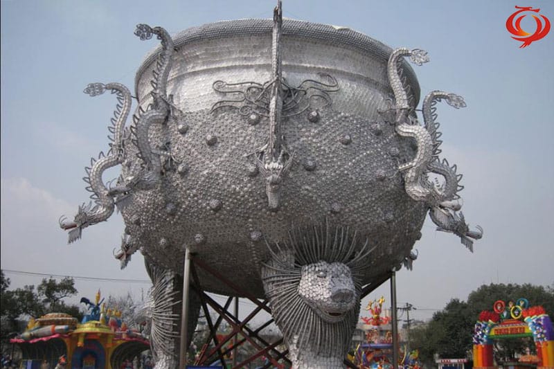 “九龍鼎”采用景德鎮(zhèn)青花玲瓏瓷具杯、羹、匙、盅、盤、碟、碗等近30萬件手工捆扎而成,主體為鋼結(jié)構(gòu);鼎高和直徑均為18米,最大處直徑26米,總重近100噸。其創(chuàng)意深邃,規(guī)?;趾耄に嚲?,史無前例,令人震撼,為世界之最,堪稱“燈王”。 自貢燈會(huì)九龍鼎入選中國(guó)世界紀(jì)錄協(xié)會(huì)世界最大九龍鼎,創(chuàng)下中國(guó)世界紀(jì)錄協(xié)會(huì)新的世界之最。
