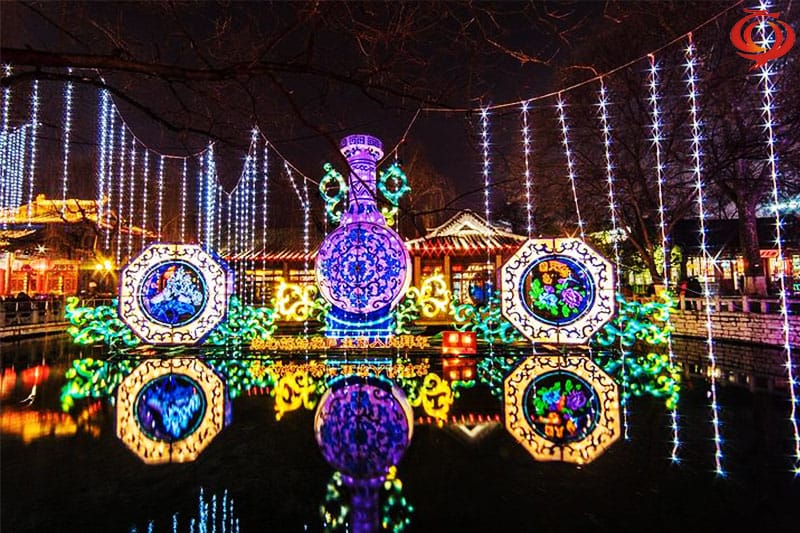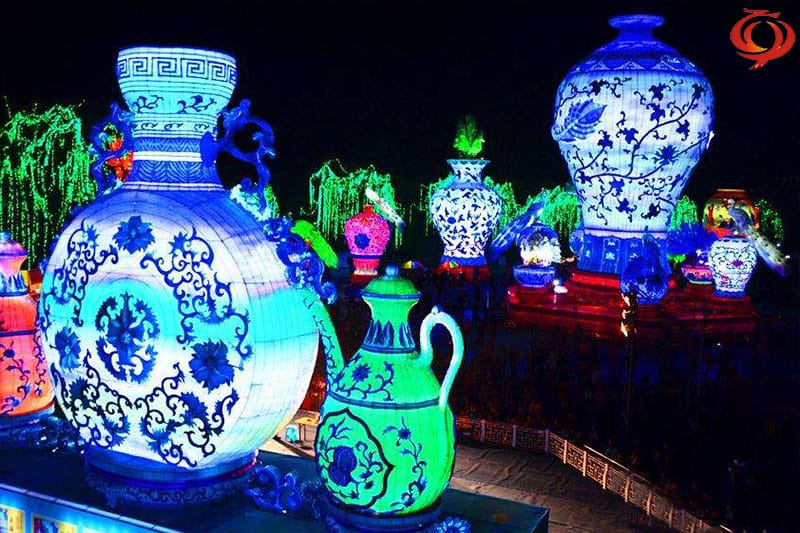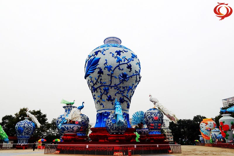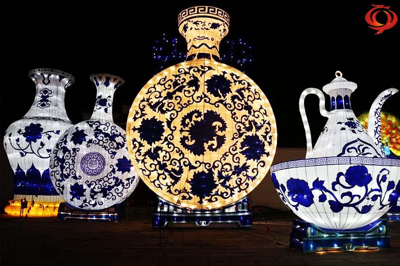 青花瓷又稱白地青花瓷,常簡稱青花,是中華陶瓷燒制工藝的珍品,樸素淡雅卻又不失高貴。位于地池之畔的“中華國粹-青花瓷瓶”燈組,相比其它花燈,給人以格外精致之感。青花瓷瓶彩燈燈組充分展示了獨(dú)特的陶瓷藝術(shù)的美,抽象青花瓷瓶造型為設(shè)計(jì)出發(fā)點(diǎn),將中國古典元素與節(jié)日氣氛完美融合,全部采用冷光源LED燈泡組成的花燈,不僅以光雕的方式完美呈現(xiàn)了中華國粹元青花的雅致和精美,而且更加節(jié)能環(huán)保,是花燈制作工藝的新嘗試?!?/p>